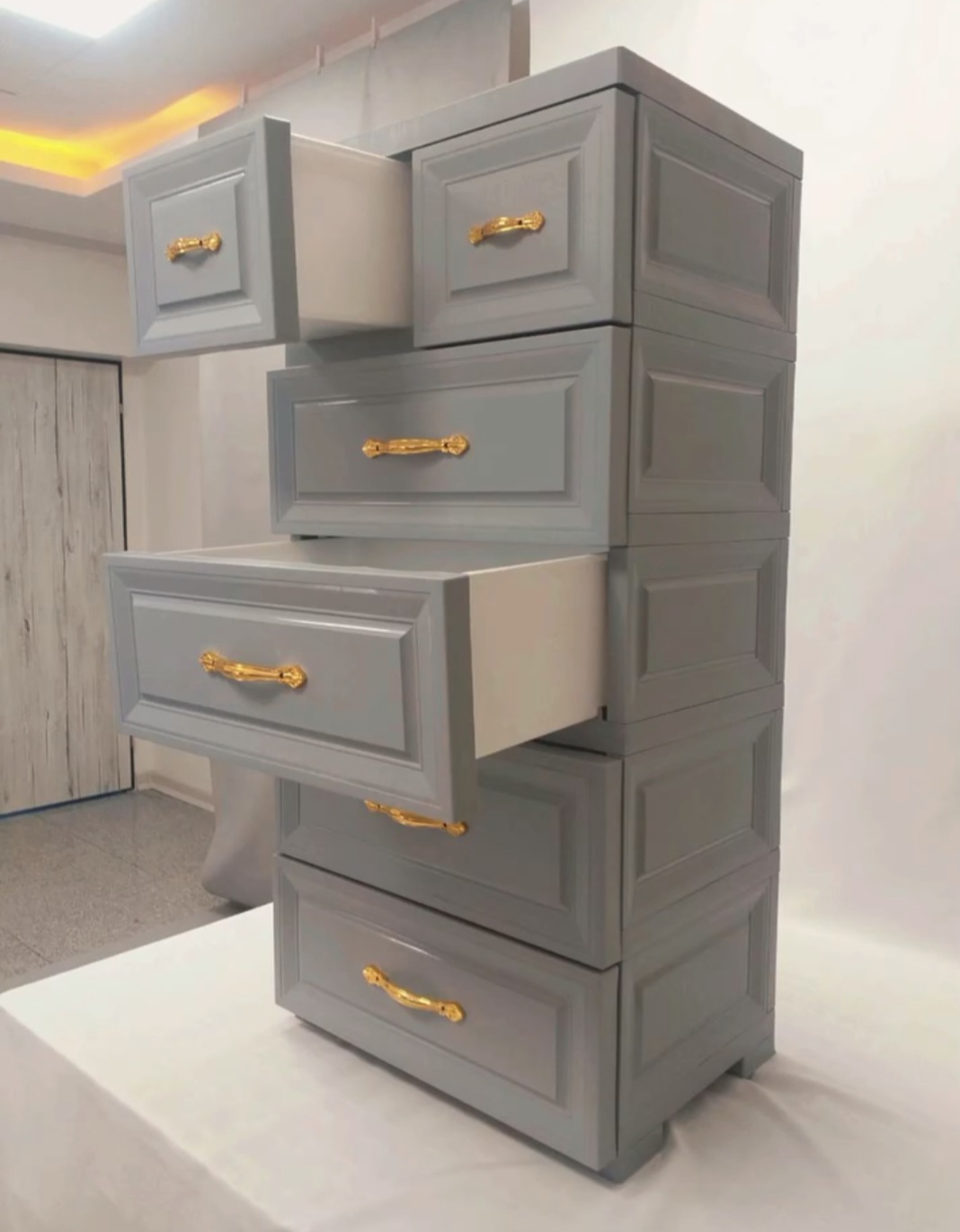 دراور پلاستیکی ممتاز مدل اس ۵،عرض ۵۸،عمق ۴۲،ارتفاع ۱۲۱،در رنگ های سفید،طوسی،کرم،قهوه ای و صورتی،جنس پلاستیک فشرده،بسیار کاربردی برای اتاق،محل کار،ابزار،کتاب و لباس،پایه دارد،ارتفاع داخل کشو ۱۹ سانت،خدمات پس از فروش دارد